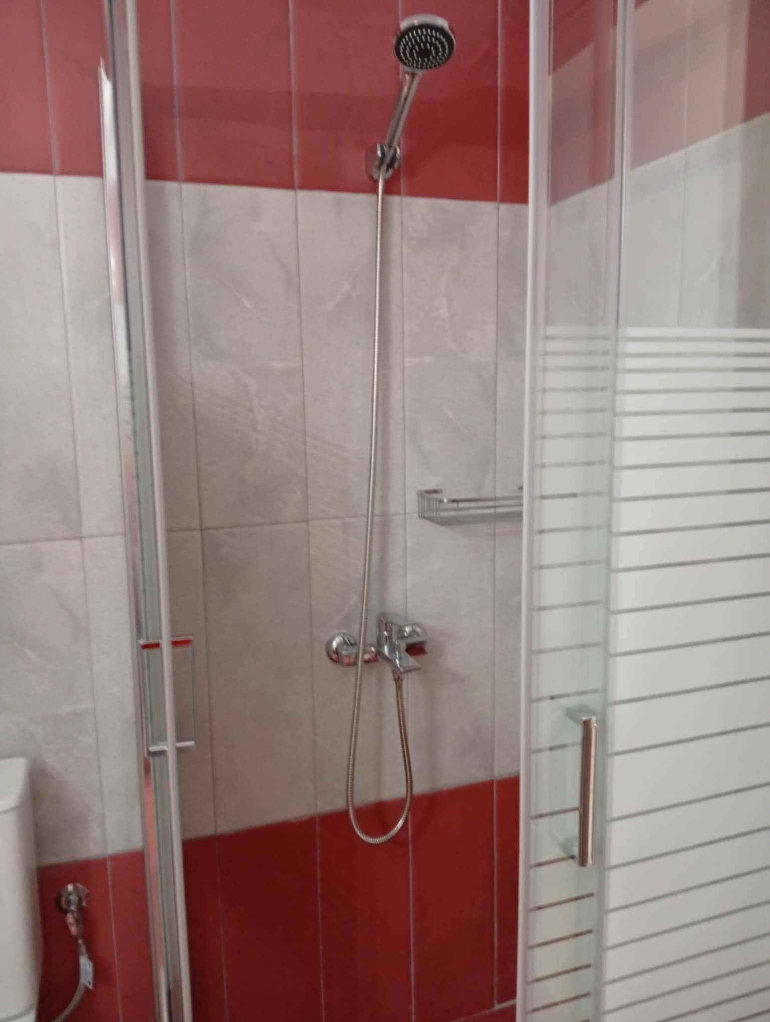 Bathroom: Shower with cabin, hairdryer, towels, toilet paper